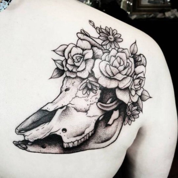 黑灰色玫瑰花和骷髅头纹身图片手稿