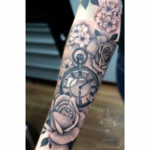 手臂胳膊上的欧美黑灰钟表玫瑰纹身图案9张