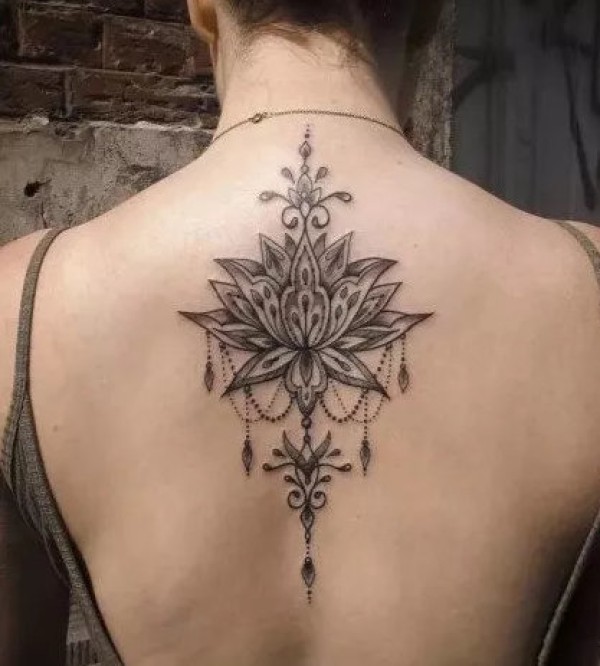 女生后背脊椎处超唯美的莲花梵花纹身图