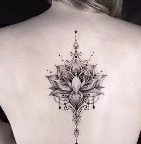女生后背脊椎处超唯美的莲花梵花纹身图