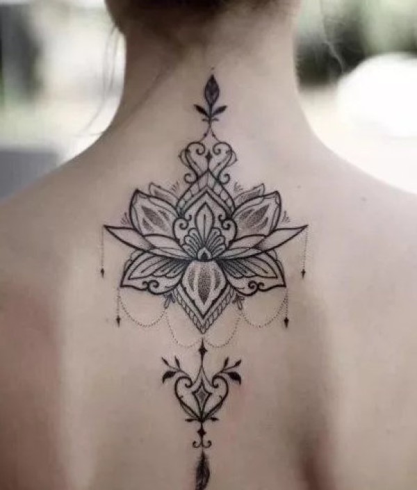 女生后背脊椎处超唯美的莲花梵花纹身图