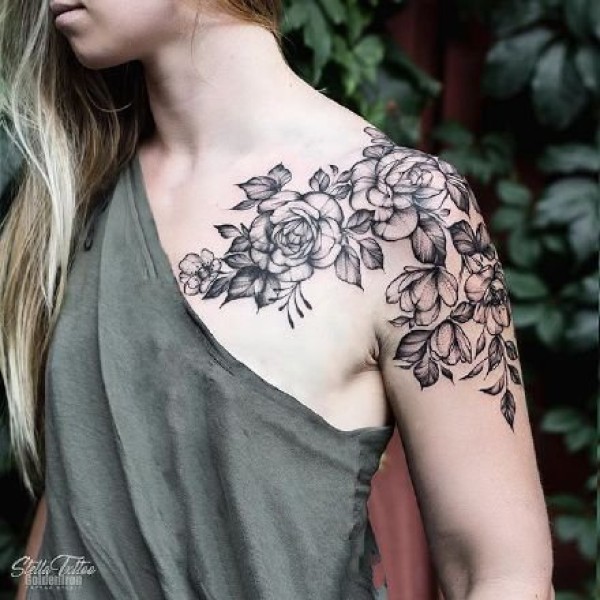 大臂素花纹身 9款女士的大臂黑灰花朵植物纹身图案