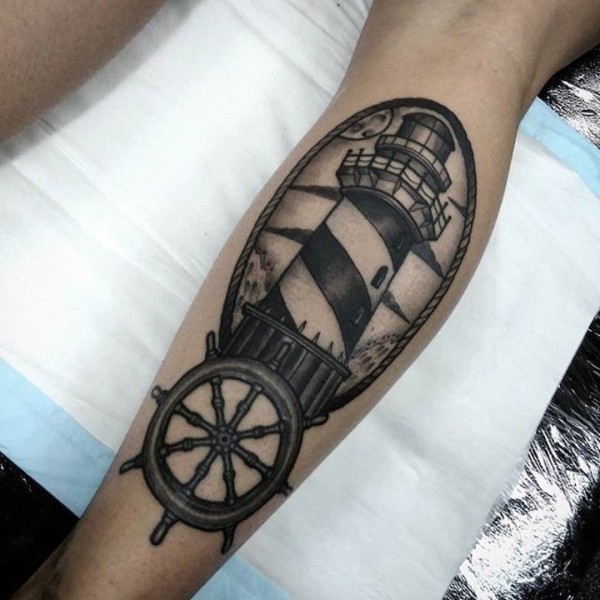 大臂纹身图 男生大臂上齿轮和灯塔纹身图片