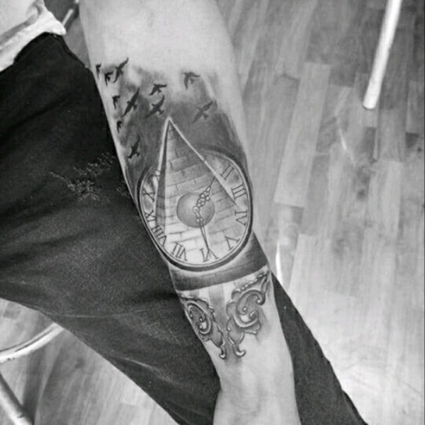 黑臂时钟纹身--一组男士小手臂上的黑臂时钟指南针纹身图案