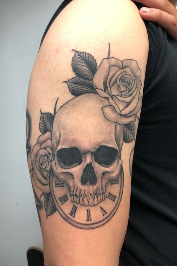 个性男孩手臂骷髅与时钟鸽子纹身图案