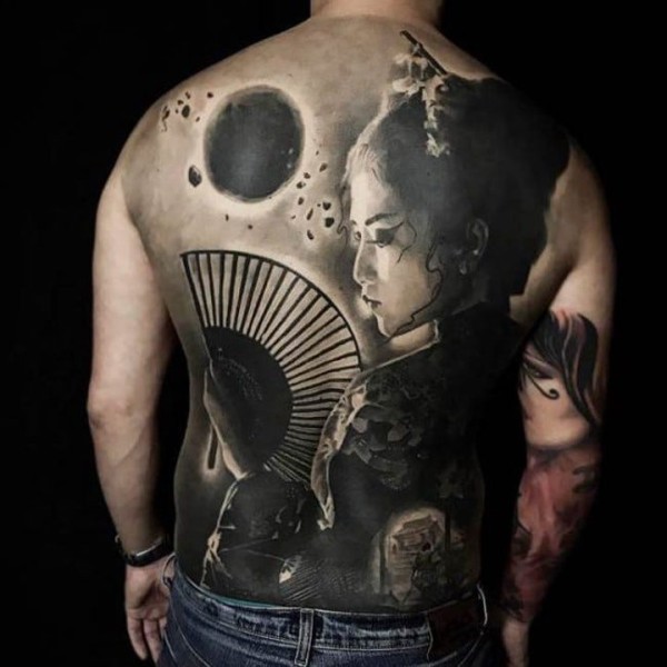 日本艺妓纹身图 黑灰或彩绘的日本艺妓包臂纹身图案