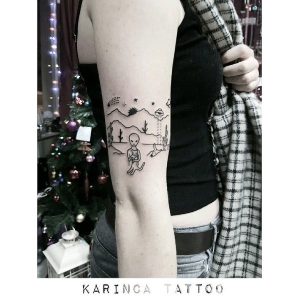 女生大臂上彩绘渐变简单线条小清新植物仙人掌纹身图片