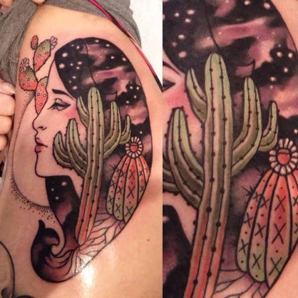植物纹身 女生大腿上彩色的仙人掌纹身图片