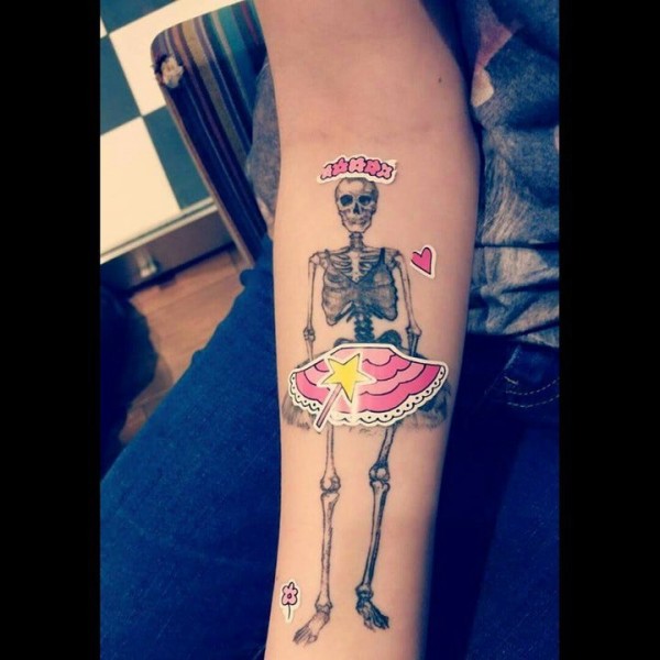 女生手臂经典潮流的骷髅与玫瑰花纹身图案