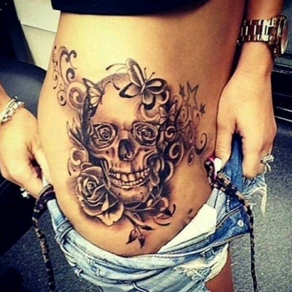 满背蝴蝶骷髅和花纹身图案
