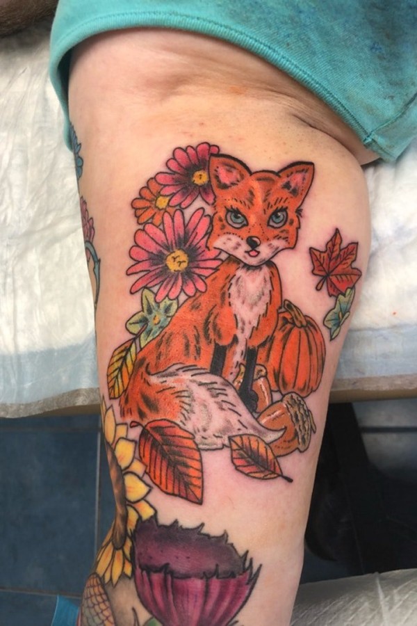 小动物纹身 女生大腿上花朵和狐狸纹身图片