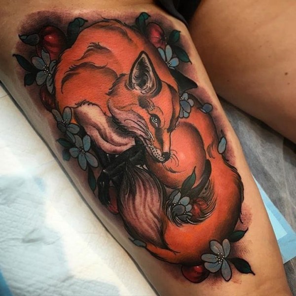 小动物纹身 女生大腿上花朵和狐狸纹身图片