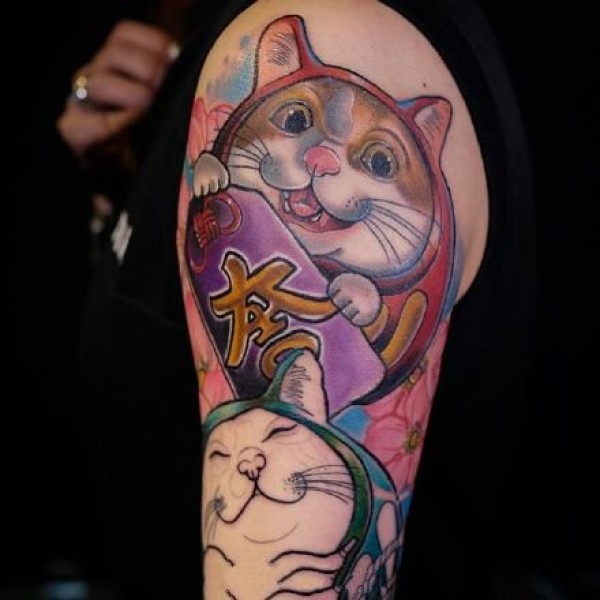 日式招财猫纹身女生手臂上日式招财猫面具纹身图片