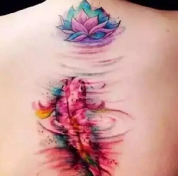 女生后腰纹身黑白灰风格抽象线条纹身图案