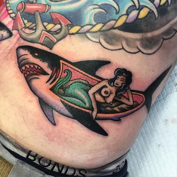 漂亮性感女孩身上美丽的美人鱼纹身图案鱼