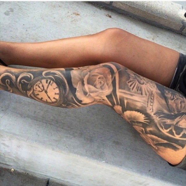 传统花腿纹身--18张传统风格的大花腿纹身图案作品