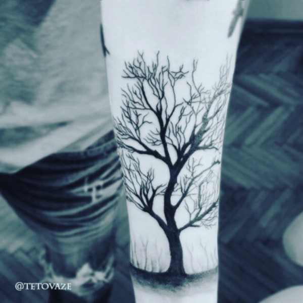 森林树木纹身图案_一组手臂上黑灰树木森林纹身图案作品