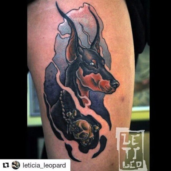 大腿上彩色植物纹身小花朵和狗头纹身图片