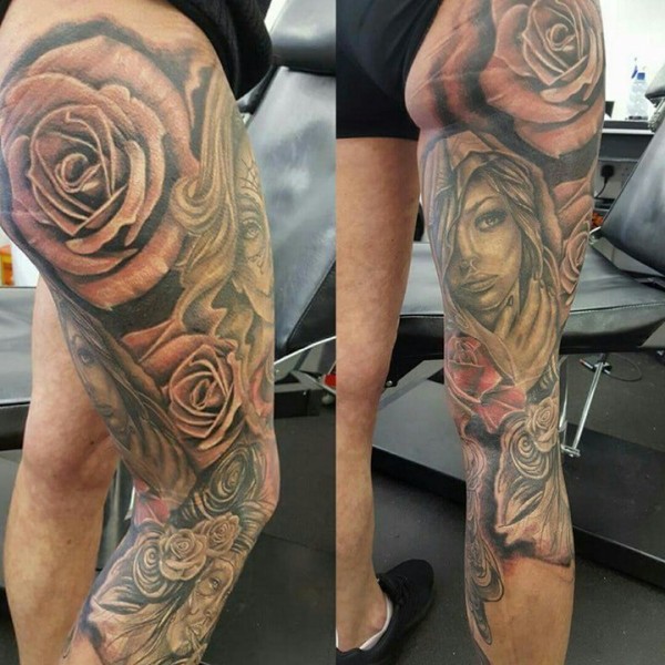 小腿玫瑰花纹身:9张小腿上漂亮的一组玫瑰花纹身图案