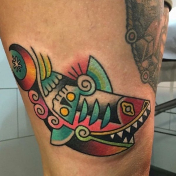 双大臂纹身 男生大臂上彩色的鲨鱼纹身图片