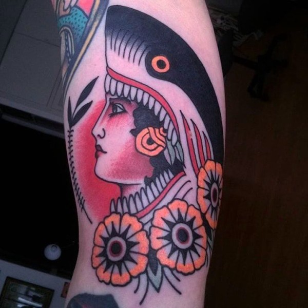 双大臂纹身 男生大臂上彩色的鲨鱼纹身图片