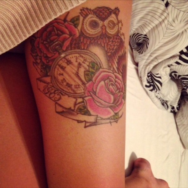 手臂胳膊上的欧美黑灰钟表玫瑰纹身图案9张