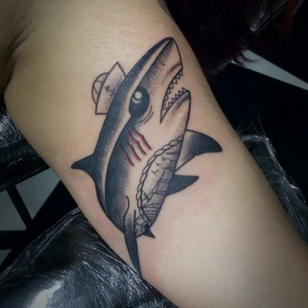 双大臂纹身 男生大臂上彩色的鲨鱼纹身图片
