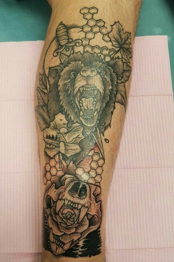 小腿写实熊头像纹身图案