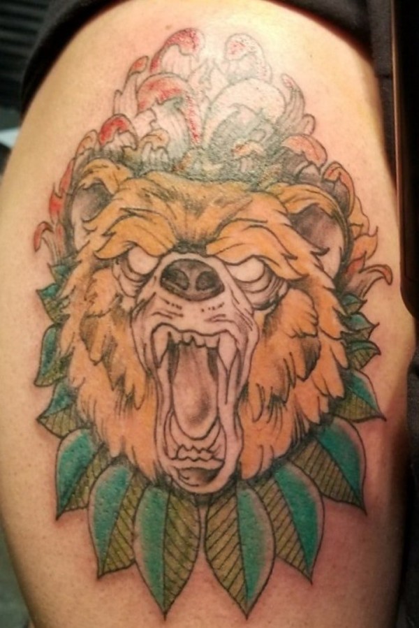 大腿上逼真的怒吼的熊纹身图片