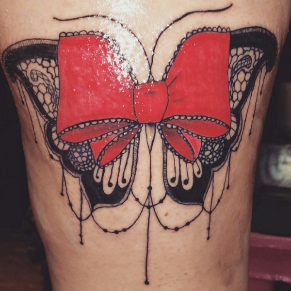女生腿部唯美时尚的蝴蝶结蕾丝纹身图案_蝴蝶纹身图案大全_纹身图吧