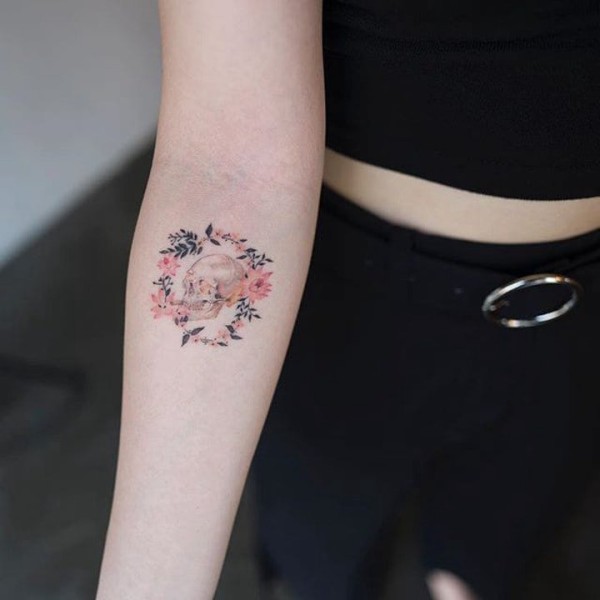 女生手臂经典潮流的骷髅与玫瑰花纹身图案