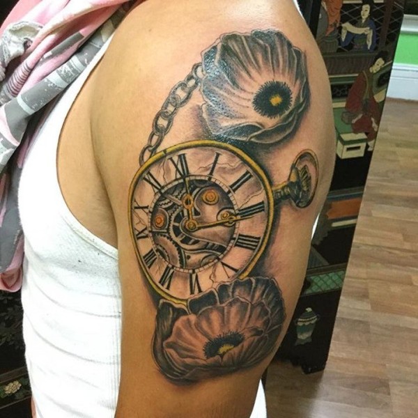 手臂胳膊上的欧美黑灰钟表玫瑰纹身图案9张