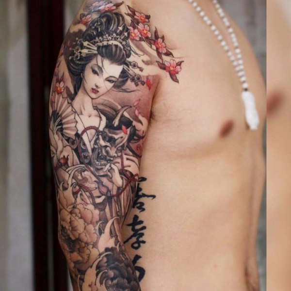日本艺妓纹身图 黑灰或彩绘的日本艺妓包臂纹身图案