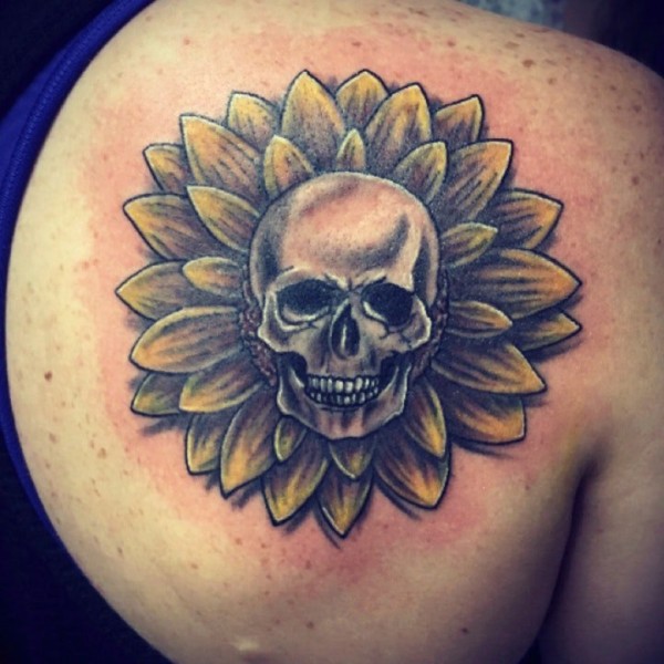 向日葵纹身图片 女生后背上彩色的向日葵纹身图片