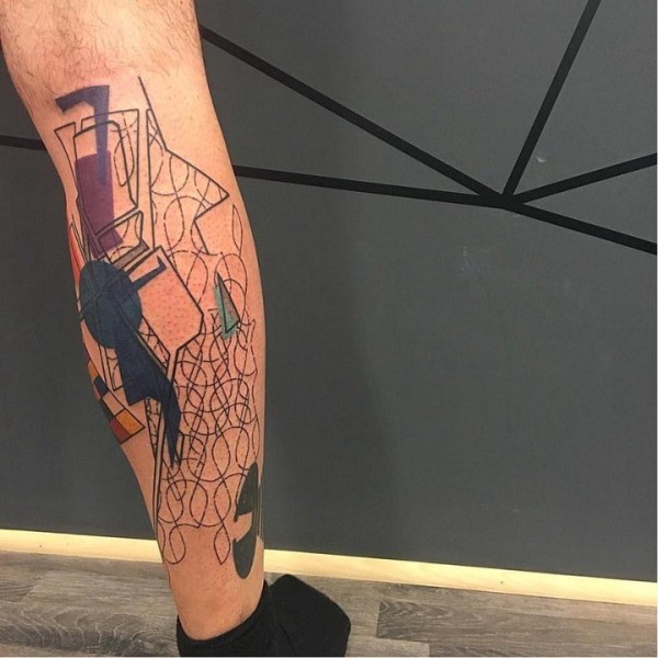 大腿上黑白灰风格点刺身抽象线条人物肖像纹身图片