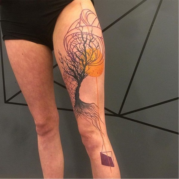 大腿上黑白灰风格点刺身抽象线条人物肖像纹身图片