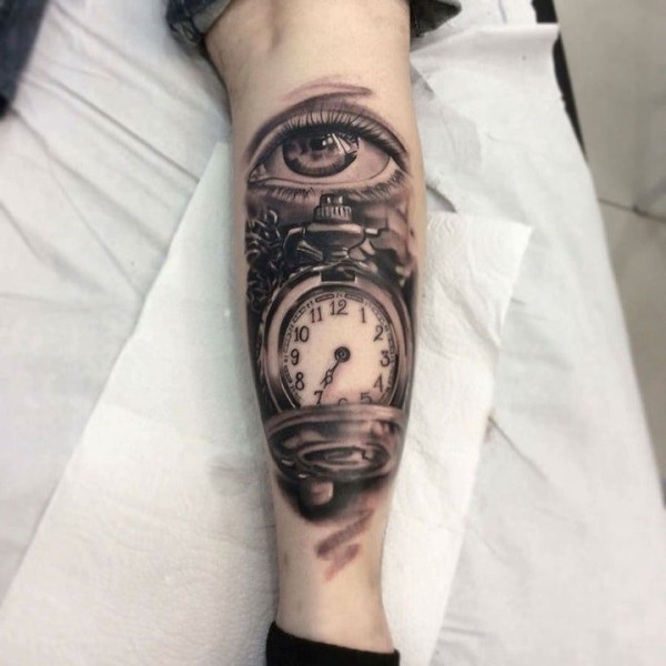 手臂胳膊上的欧美黑灰钟表玫瑰纹身图案9张
