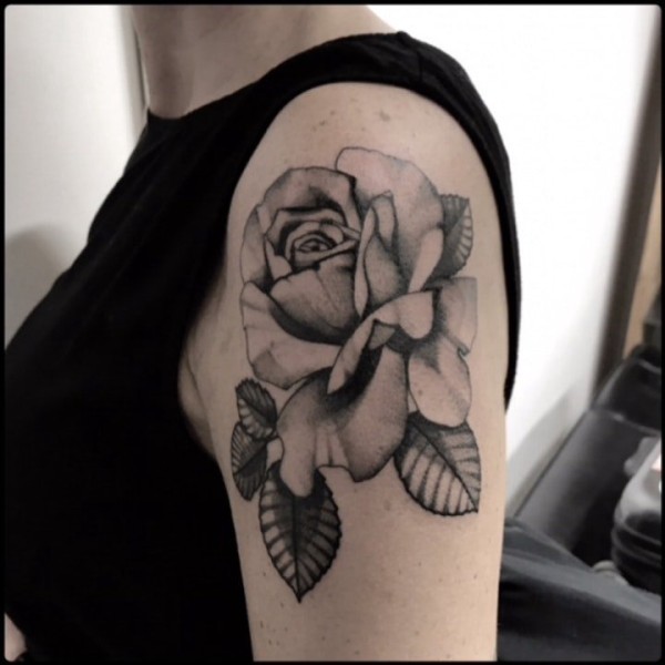 黑灰色玫瑰花和骷髅头纹身图片手稿