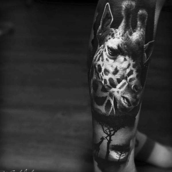 欧美小腿纹身 男生小腿上黑色的长颈鹿纹身图片