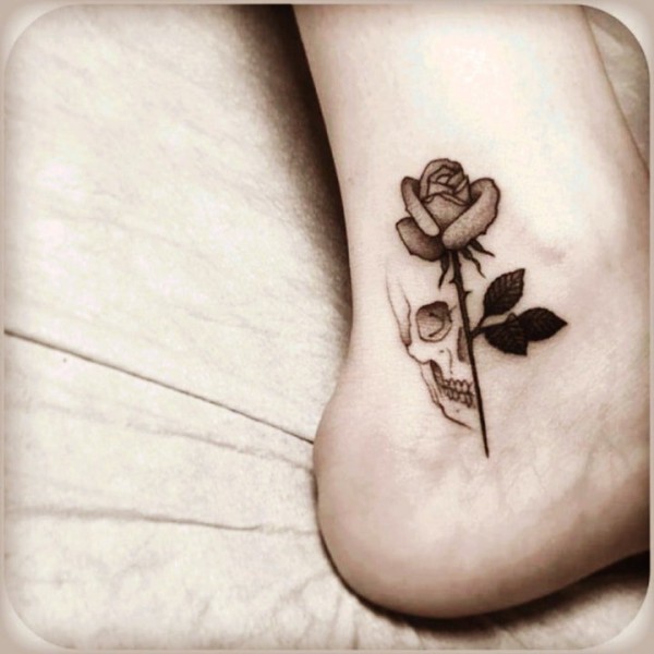 黑灰色玫瑰花和骷髅头纹身图片手稿
