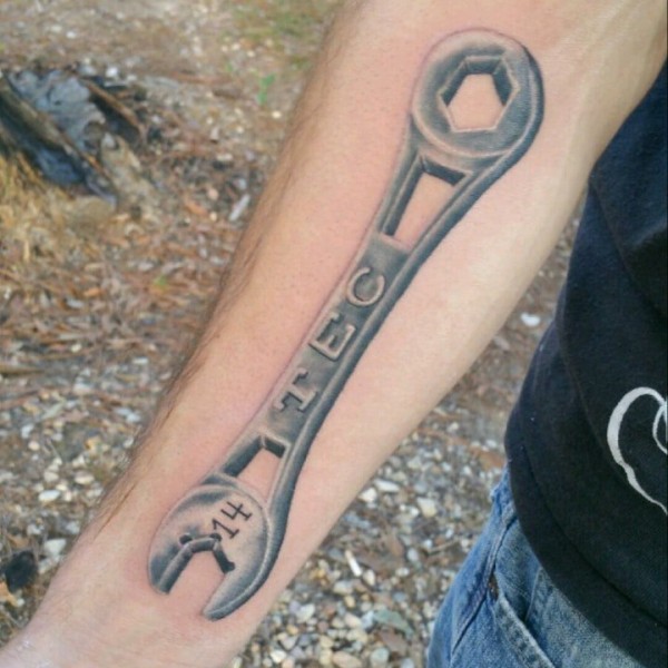 男生手臂上黑灰点刺几何简单线条扳手工具纹身图片