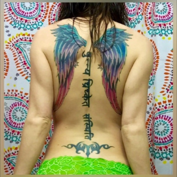 女性背部一串经典的梵文纹身_梵文纹身图案大全_纹身图吧
