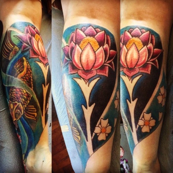 日本花腿纹身樱花纹身鲤鱼荷花粗线条纹身图片