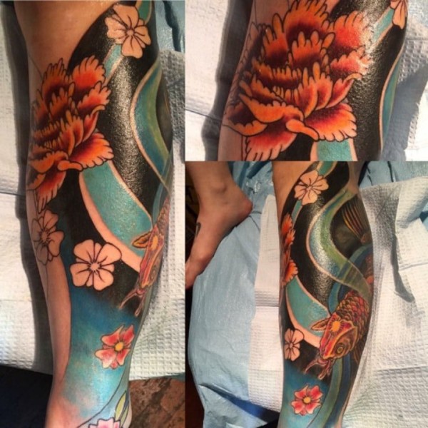 日本花腿纹身樱花纹身鲤鱼荷花粗线条纹身图片