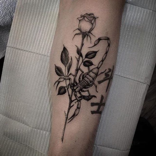 黑色蝎子图腾纹身,配合了字母纹身