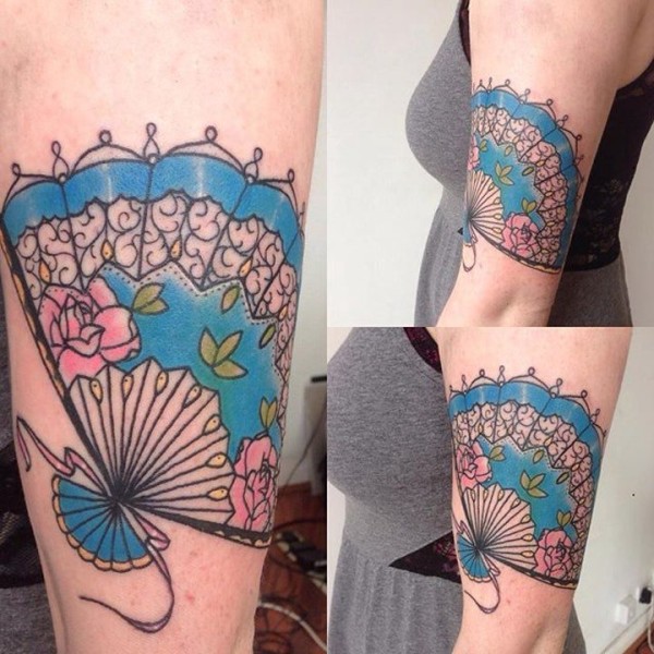 双大臂纹身 女生大臂上杯子和扇子纹身图片