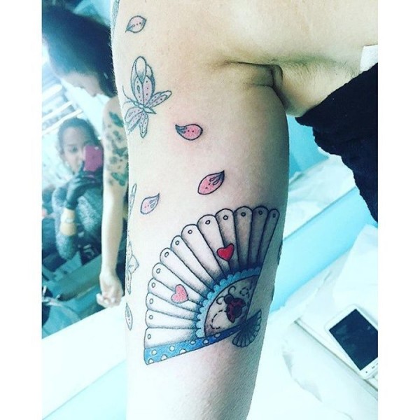 双大臂纹身 女生大臂上杯子和扇子纹身图片