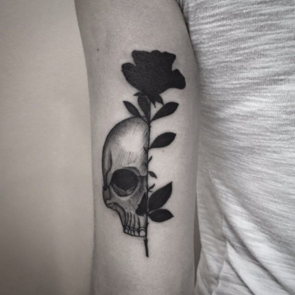 黑灰色玫瑰花和骷髅头纹身图片手稿