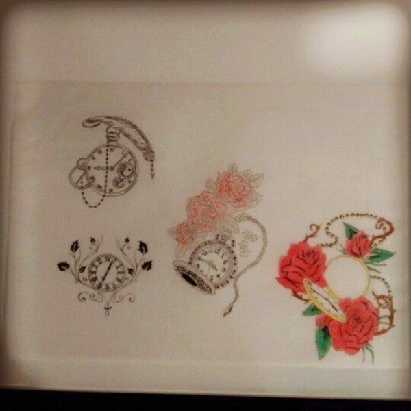 手臂胳膊上的欧美黑灰钟表玫瑰纹身图案9张