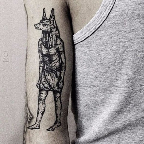古埃及纹身 男生大臂上彩色的阿努比斯纹身图片